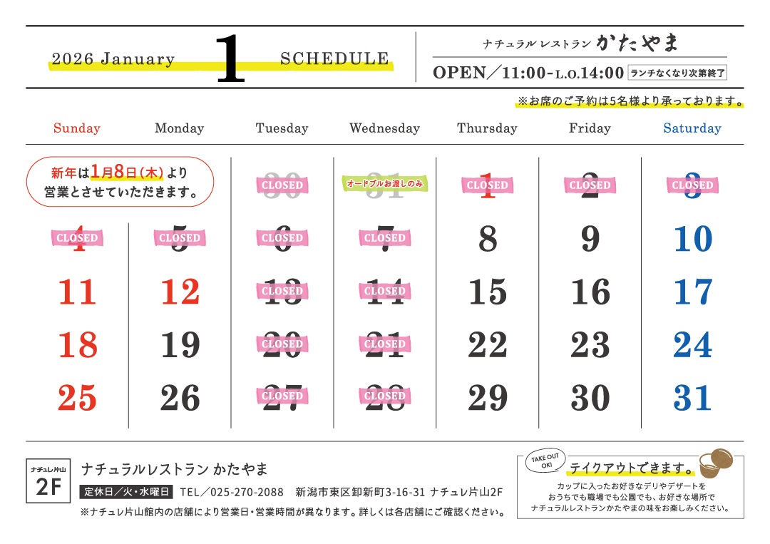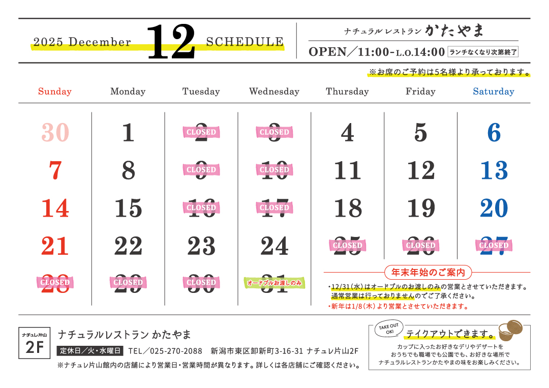 いつもご利用いただき、誠に有難うございます。2025年12月・2026年1月の営業カレンダーです。12月31日(水)は通常営業を行わずオードブルお渡しのみとなります。その他12月は営業日の変更など一部変則的な営業となりますので、ご注意くださいませ。また新年の営業は1月8日(木)より営業いたします。皆さまのお越しを心よりお待ちしております。
