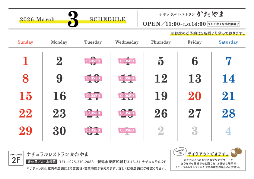いつもご利用いただき、誠に有難うございます。2026年3月の営業カレンダーです。通常通り火・水曜日のお休みとなります。皆さまのお越しを心よりお待ちしております。